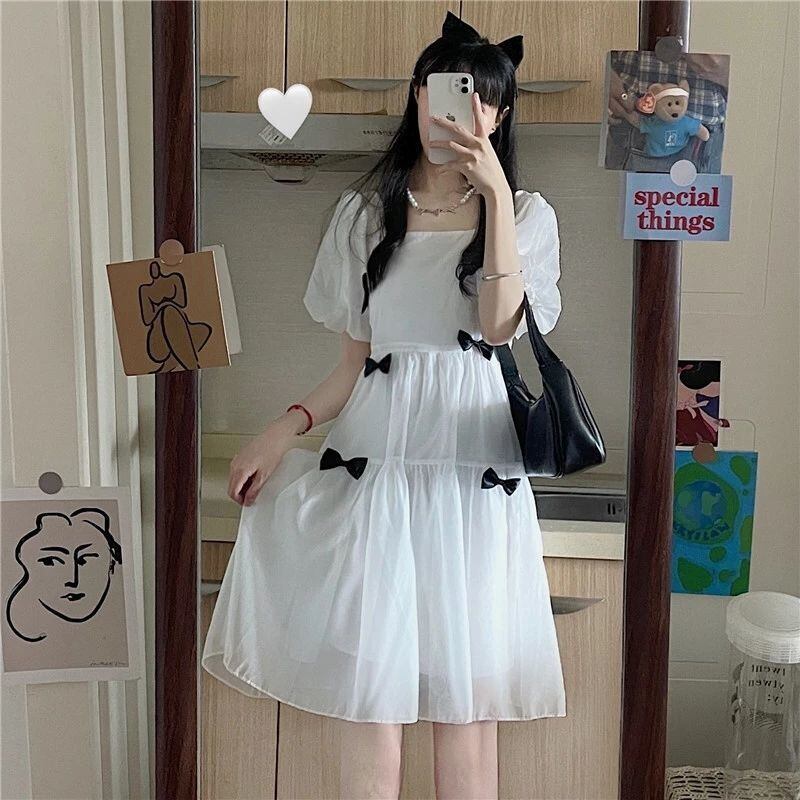 甘いドレス夏 2022 女性弓スクエアカラーパフスリーブパーティードレスシックな休日の妖精 Vestidos リボン 大人ガーリー スウィート キュート カジュアル サマー 夏物 スクウェア bel31646068757 | aliel