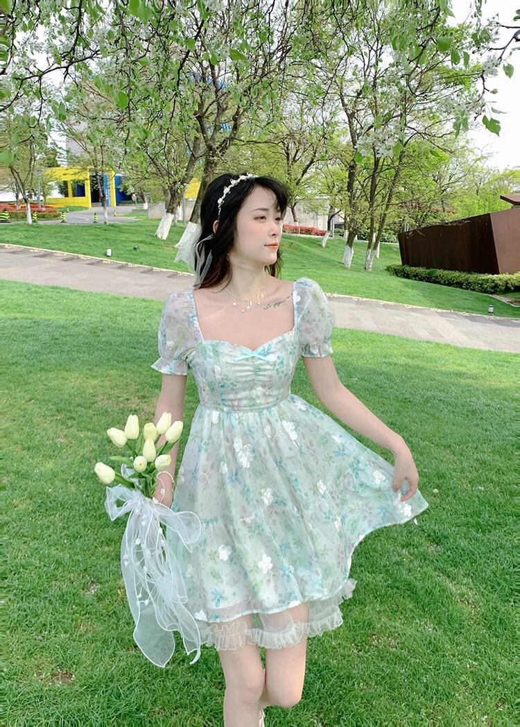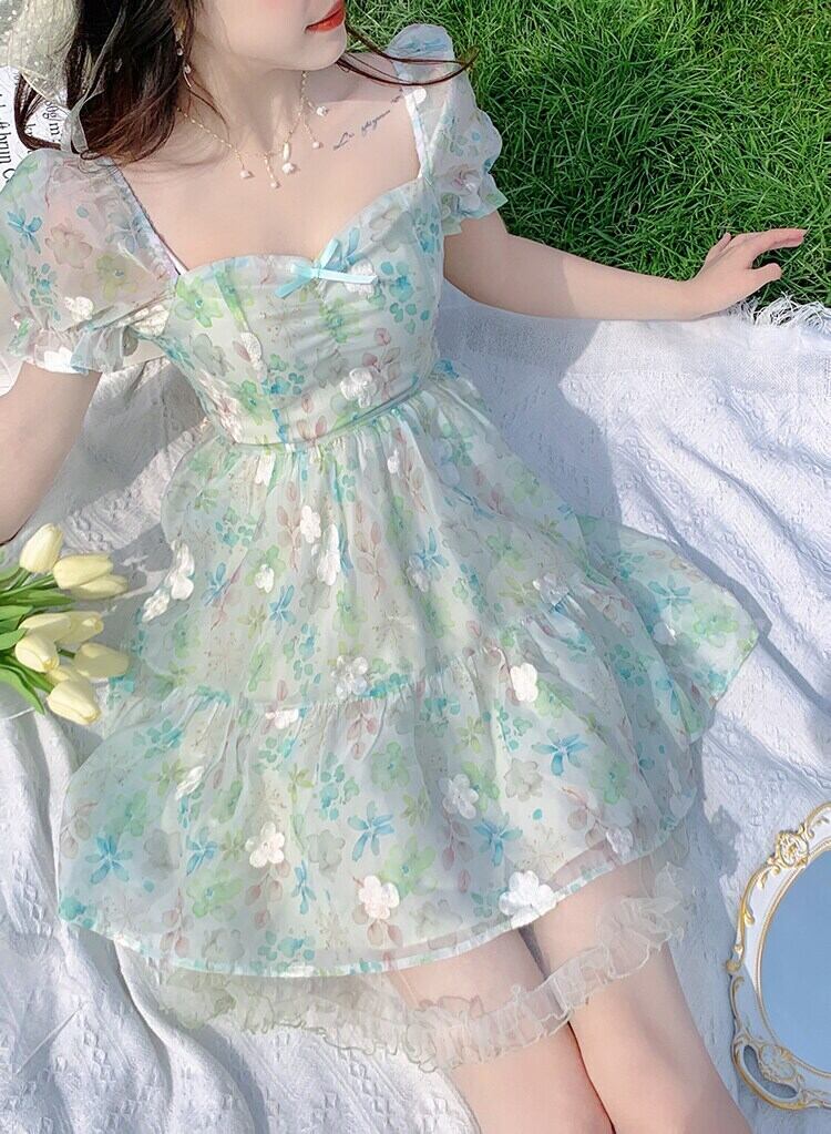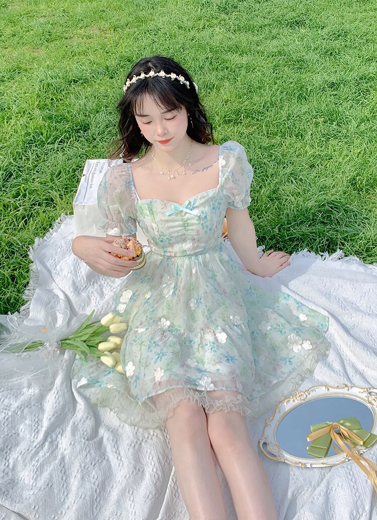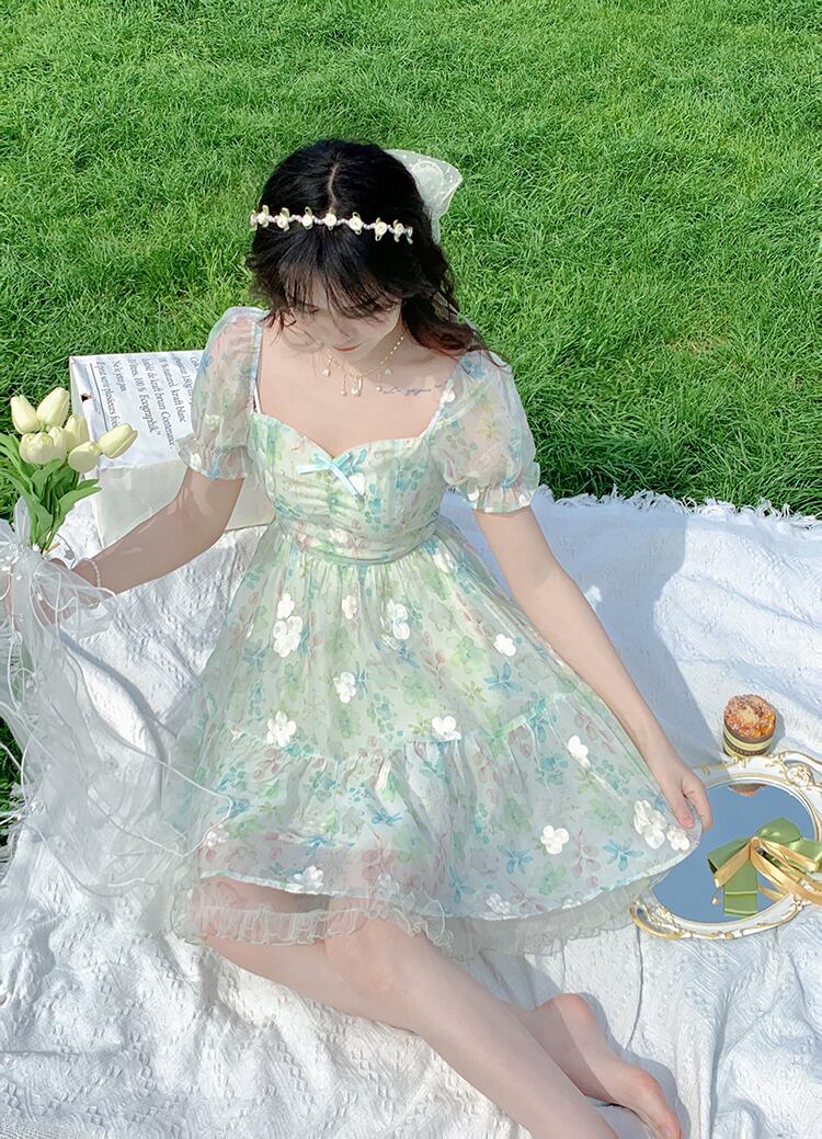 花甘いパーティーミニドレス女性プリントグリーンスタイル妖精ドレスフランスドレス夏 2022 大人ガーリー スウィート キュート カジュアル サマー 夏物 花柄 bel96665664039 | aliel