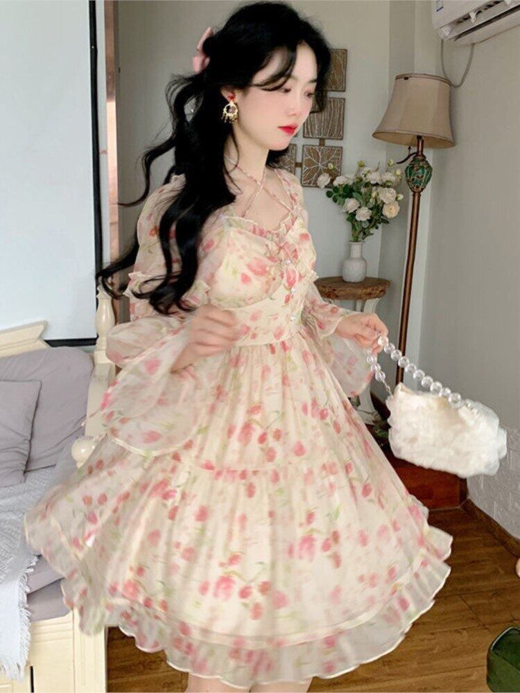 2022 夏ファッション カジュアル プリント ドレス シフォン花柄ドレス春フレンチ スクエア ネック蝶ネクタイ ショート ドレス リボン スプリング 春物 サマー 夏物 スクウェア bel37801766958 | aliel