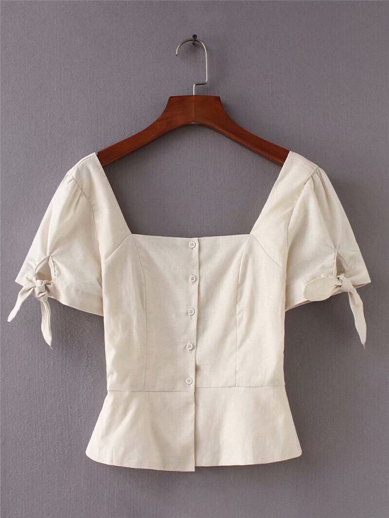 Bella Philosophy 夏コットンリネンスクエアカラーシャツ女性ショートスリムブラウスボタン蝶ネクタイ半袖 リボン ハーフスリーブ サマー 夏物 スクウェア bel5434168937 | aliel