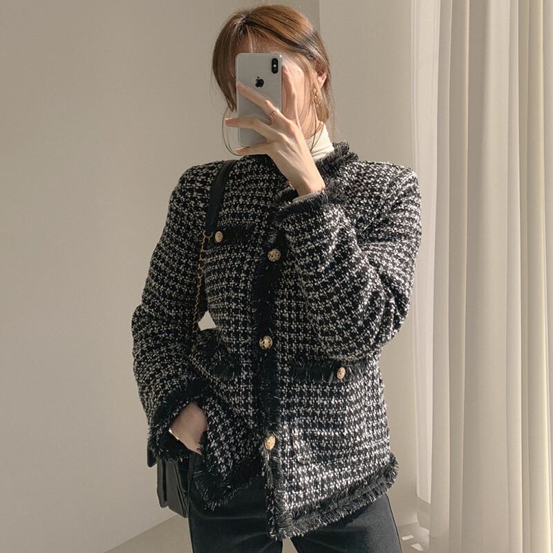 厚手の秋冬服レトロヒットカラー O ネック長袖チェック柄ツイードジャケットウール Veste Chaquetas Jaquetas ロング オータム 秋物 ウィンター 冬物 Oネック bel11497434307 | aliel