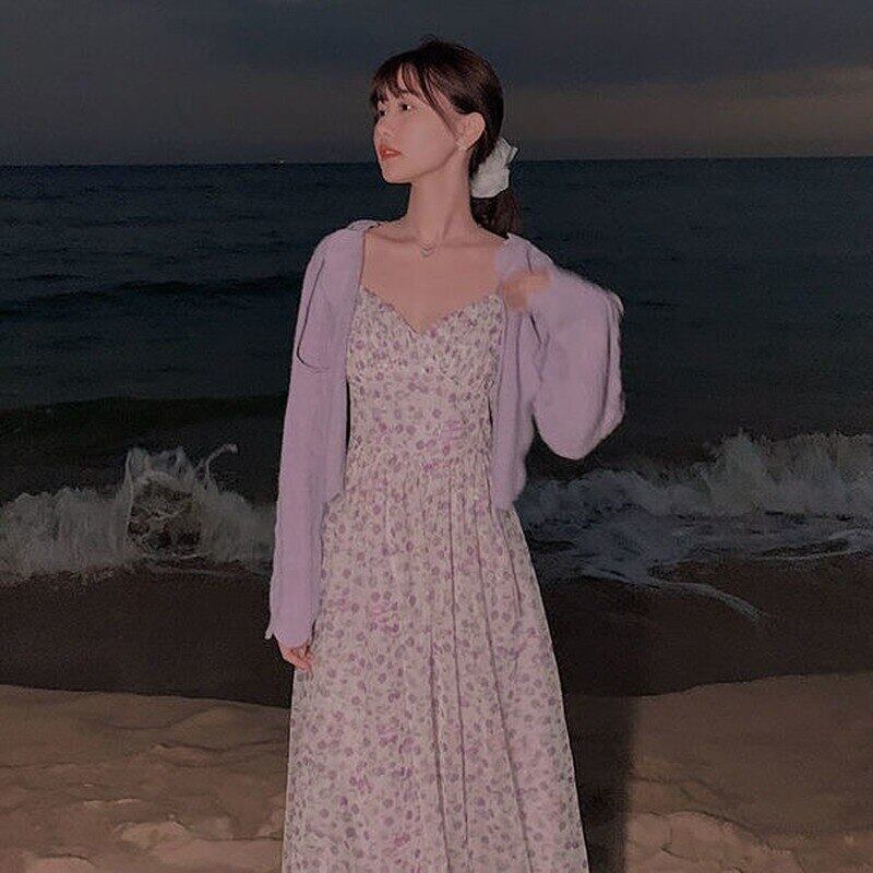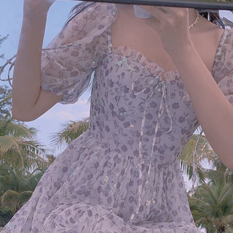 2021 夏シフォンドレススウィートフローラルミディドレススクエアカラーレースアップパーティーワンピースドレスオフィスレディ 大人ガーリー キュート カジュアル サマー 夏物 花柄 スクウェア 会社 学校 通勤や通学にも bel23856164732 | aliel