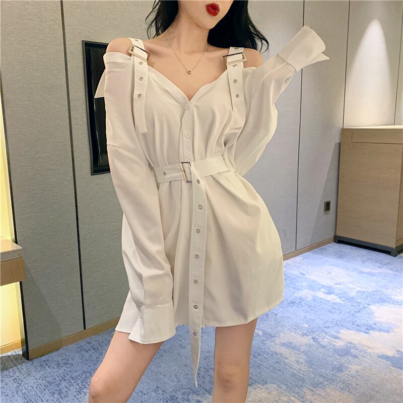 Bella Philosophy ヴィンテージ シャツ ストラップレス レディース ブラウス ブラック トップス ベルト カジュアル ロング シャツ オフ ショルダー セクシー トップス ハーネス ビンテージ bel53127367248 | aliel