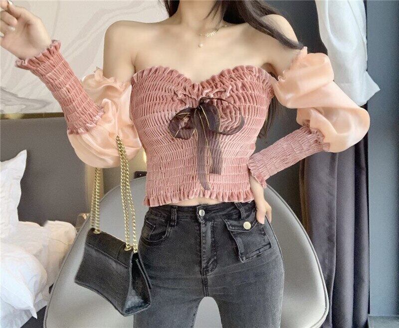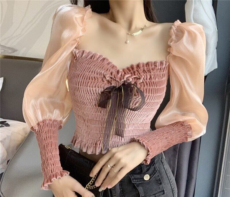 女性春ストリートオフショルダーパフスリーブベルベットパッチワークブラウスオフィスレディセクシーシャツトップス スプリング 春物 会社 学校 通勤や通学にも bel18871589511 | aliel