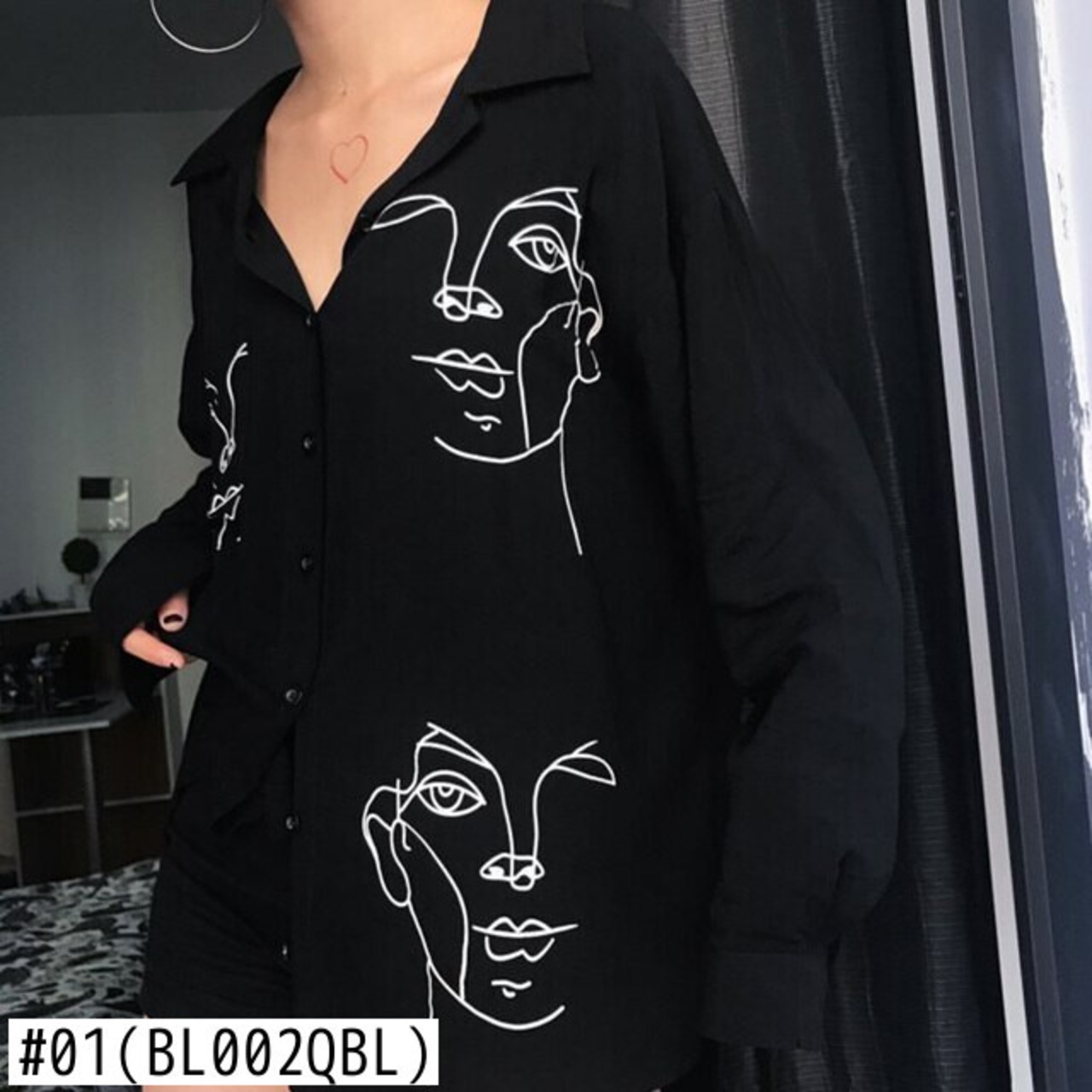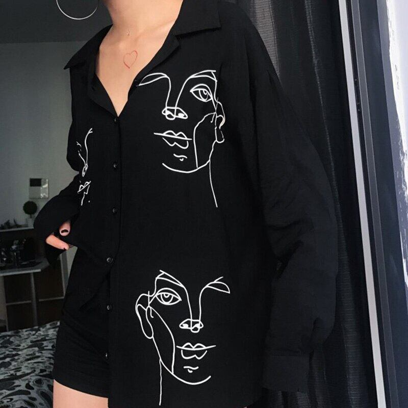 ベラ哲学 2019 夏の女性のシャツプリントトップスカップルブラウス緩い漫画プリントターンダウン襟 サマー 夏物 bel59873783653