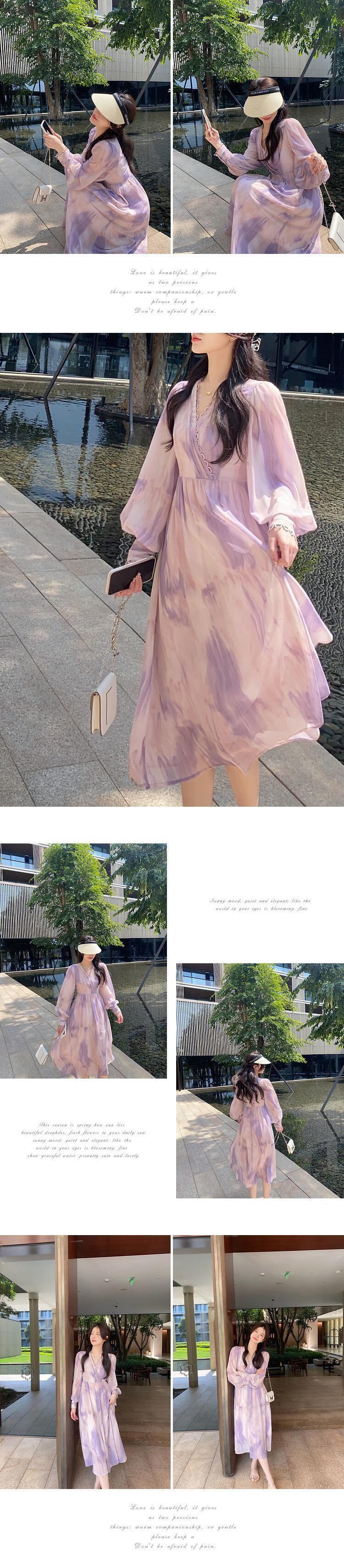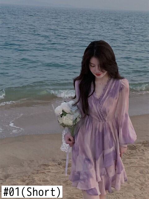 スウィートVネックパフスリーブフレンチフローラルサマーマキシドレスウエストスリムパープルホリデータイダイプリントドレスビーチドレス 大人ガーリー キュート カジュアル 夏物 花柄 bel83560729073 | aliel