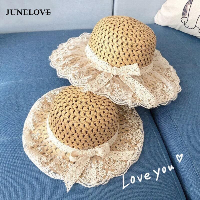 親子夏の女性の日よけ帽子バケット キャップ ベージュ レースちょう結び花リボン フラット トップ麦わら帽子ビーチ キャップ パナマ海辺 サマー 夏物 フラワーデザイン bel55108229572 | aliel