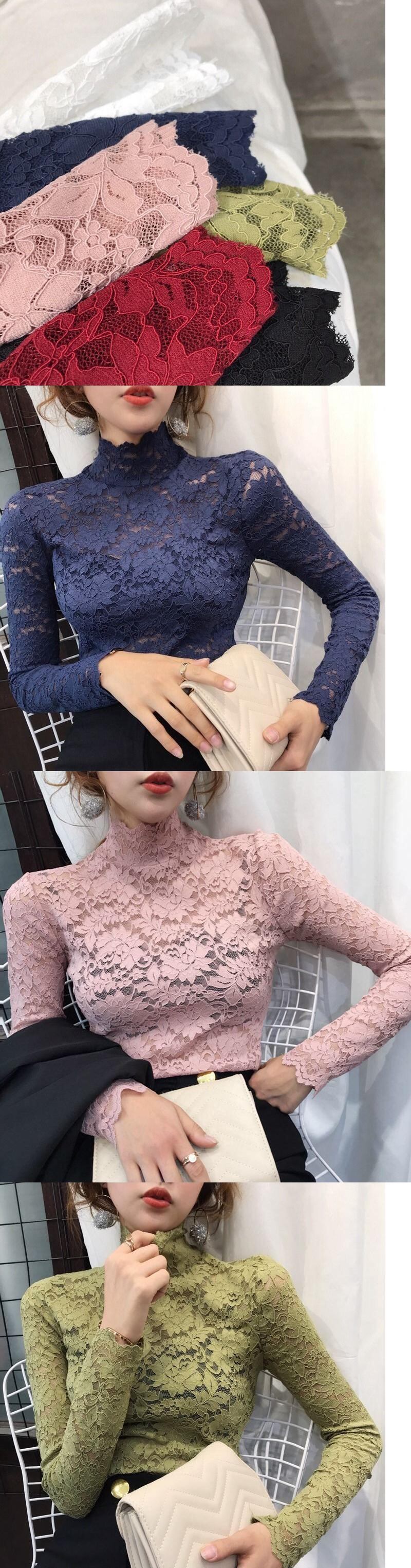 秋春女性薄い黒レース Tシャツセクシーなタートルネック長袖スリムレースかぎ針編みパッチワークブラウス Tシャツトップス ロング ブラック スプリング 春物 オータム 秋物 bel64985394172 | aliel