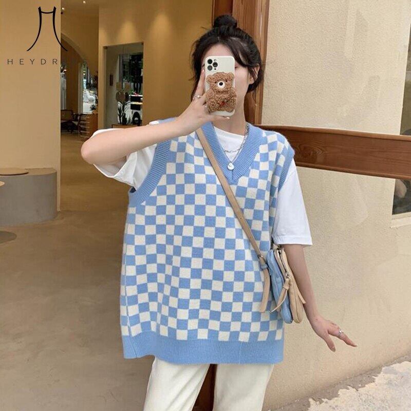 チョッキチェッカーボードセーターベストチェック柄ニットベスト女性秋ルーズ V ネック生き抜く オータム 秋物 Vネック bel97768967752