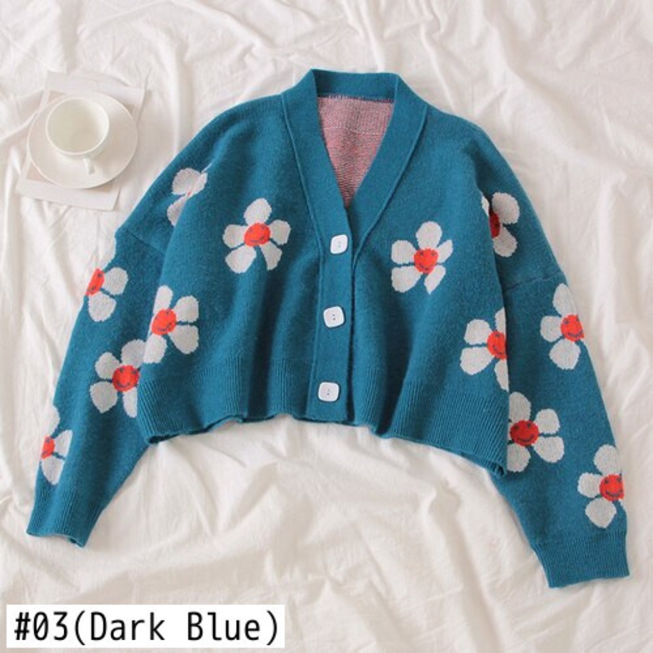 プレッピースタイルフラワーニットカーディガンセーター女性 V ネックルーズ Elegaht Thicked プルプリントショート Outwears Vネック フラワーデザイン bel96025004520 | aliel