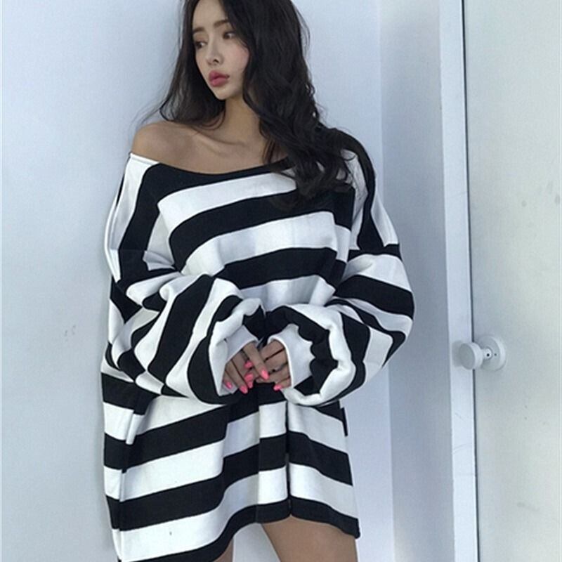 ベラ哲学ストリートセクシーな黒のストライプの Tシャツかわいいトップスロングオフショルダー Tシャツ特大の服 ブラック 大人ガーリー スウィート キュート カジュアル bel44461898883 | aliel