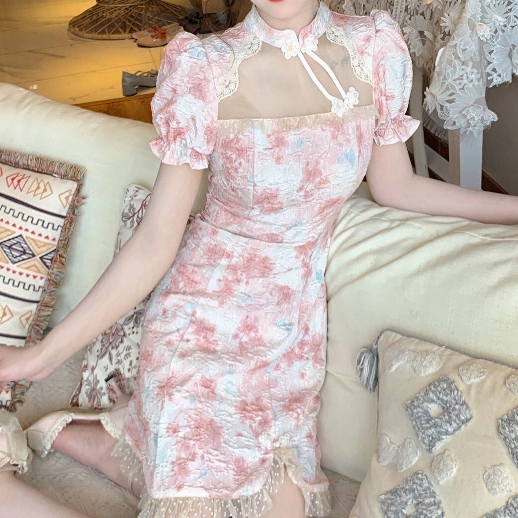2022 女性スリムパフスリーブドレスレースウエストパーティーミニドレスレディプリント中国チャイナ bel90872624655