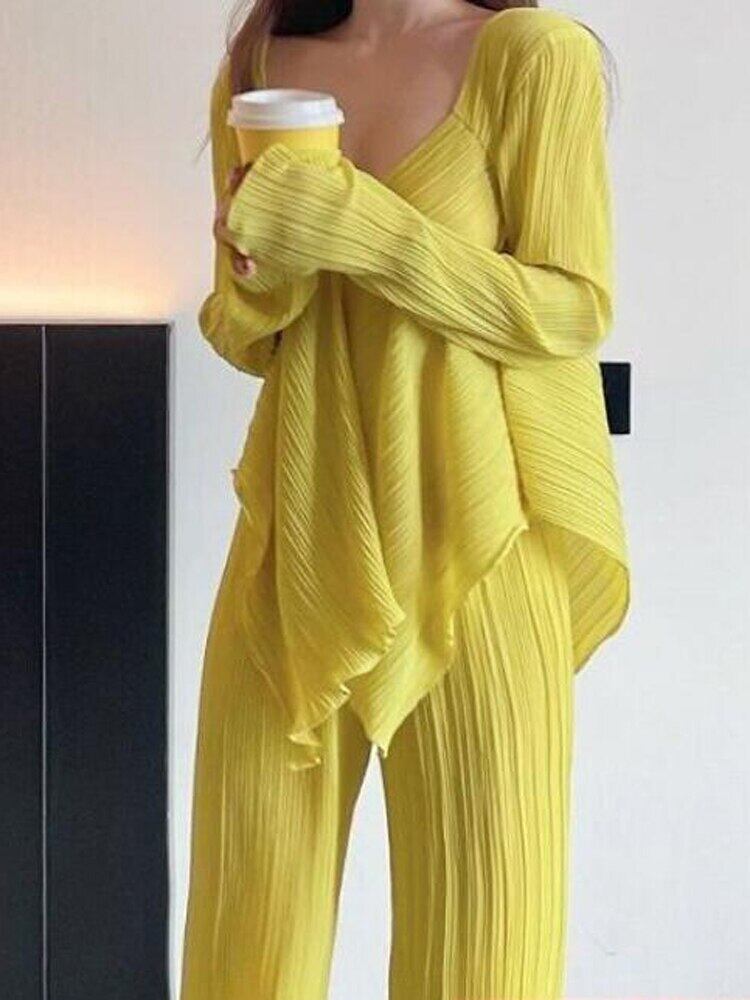 マスタードイエロープリーツVネック怠惰なスーツの女性の2022年夏夏の新しいデザインのルーズで快適でエレガントなツーピーススーツ サマー 夏物 オータム 秋物 bel64308247460 | aliel