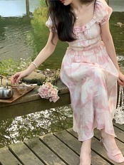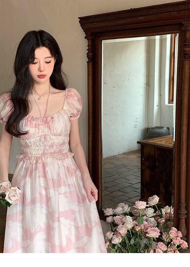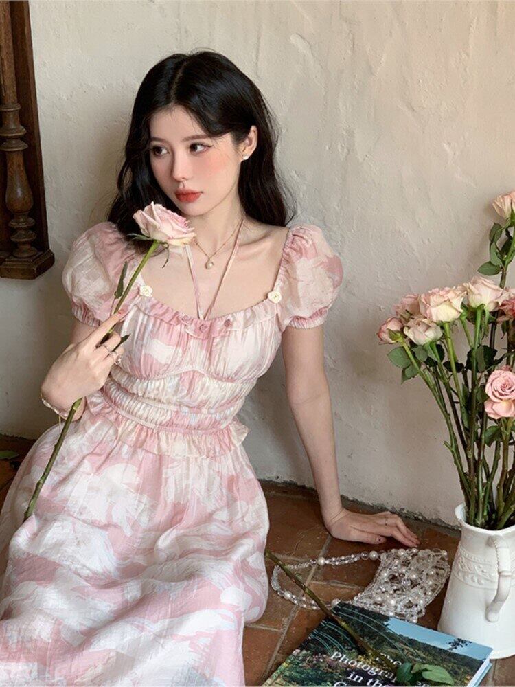 夏フレンチ女性ホリデープリントミディドレススリムレトロ甘いワンピース服 Vestidos 2022 大人ガーリー スウィート キュート カジュアル サマー 夏物 bel28562090038 | aliel