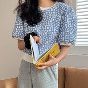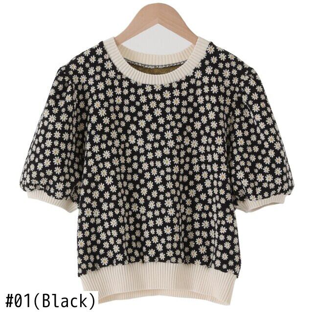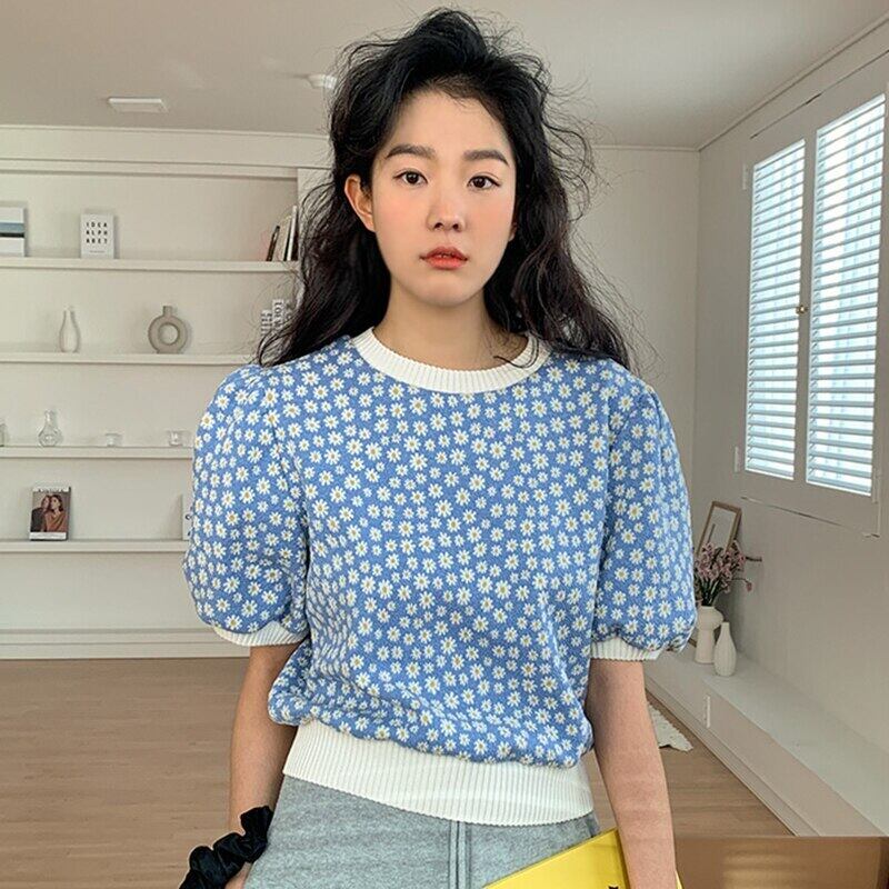 Bella Philosophy Chic Spring Round Collar Comtable Puff Short Sleeve Daisy Print Kintted Women Top Tシャツ ショート 半袖 ハーフスリーブ スプリング 春物 bel20373556943 | aliel