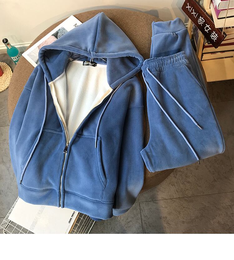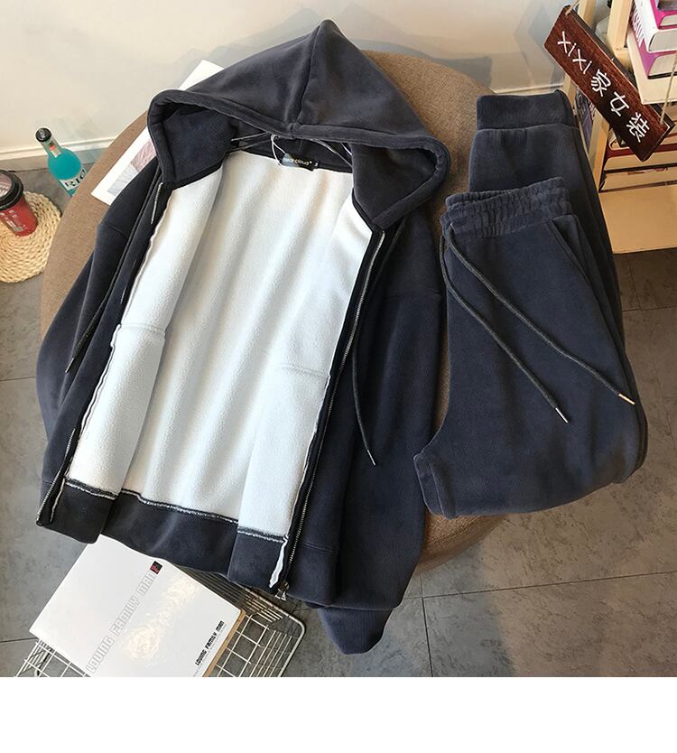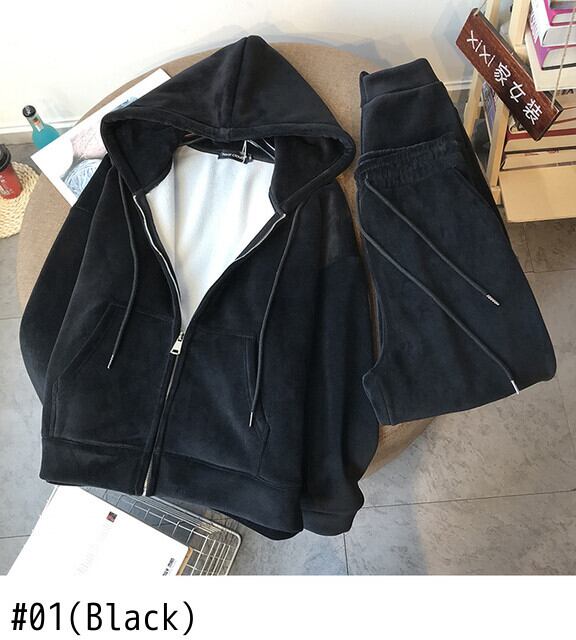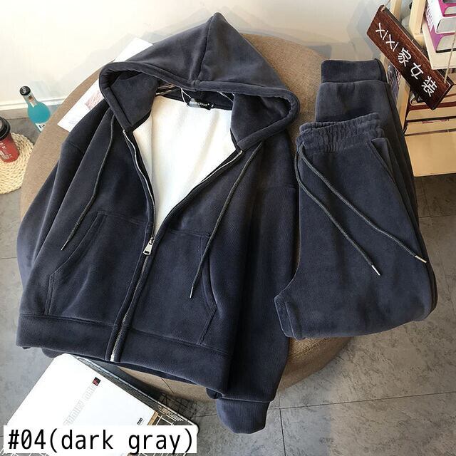 女性スポーツスーツ 2 点セット厚いフリース フード付きトップス & パンツ無地ゆったり トラック スーツ秋冬 2 PC スーツ ウィンター 冬物 ソリッドカラー bel32393058058 | aliel