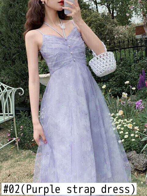 夏紫ストラップドレス女性ノースリーブ甘い妖精ドレス V ネックスパンコールパーティードレス 大人ガーリー スウィート キュート カジュアル サマー 夏物 Vネック パープル bel37485545683 | aliel