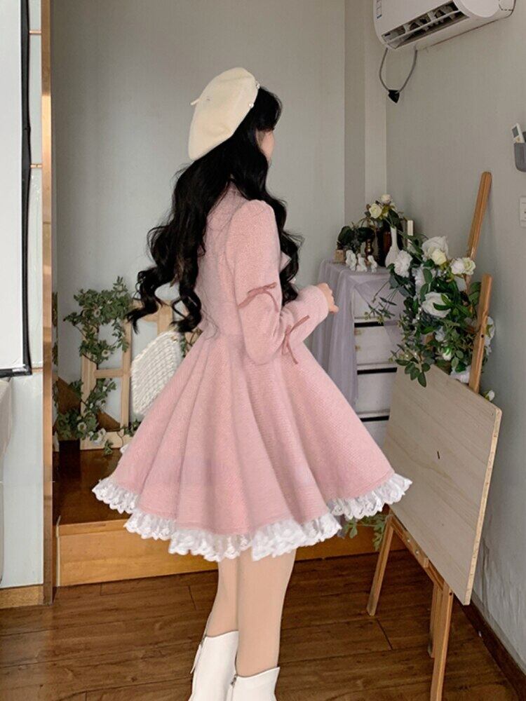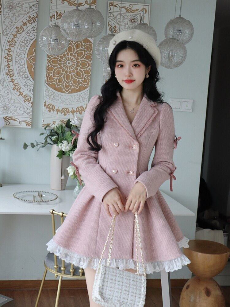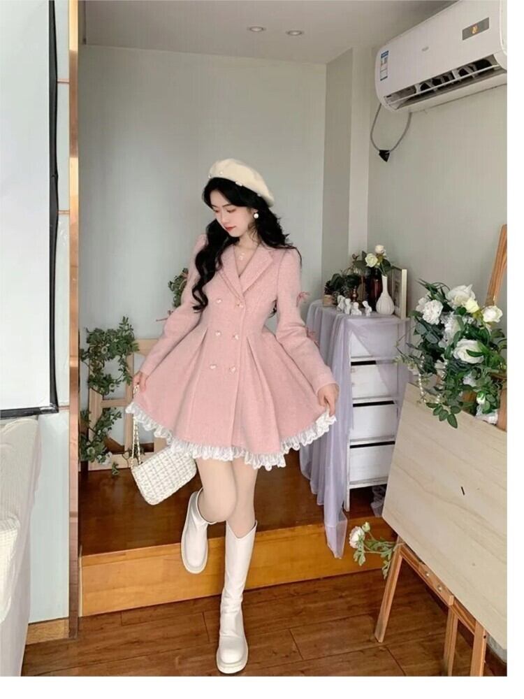 2022 冬のピンクの甘い A ラインドレス女性フリルパーティーミニドレスダブルブレスト長袖ブレザードレス ロング 大人ガーリー スウィート キュート カジュアル ウィンター 冬物 Aライン bel78020089773 | aliel