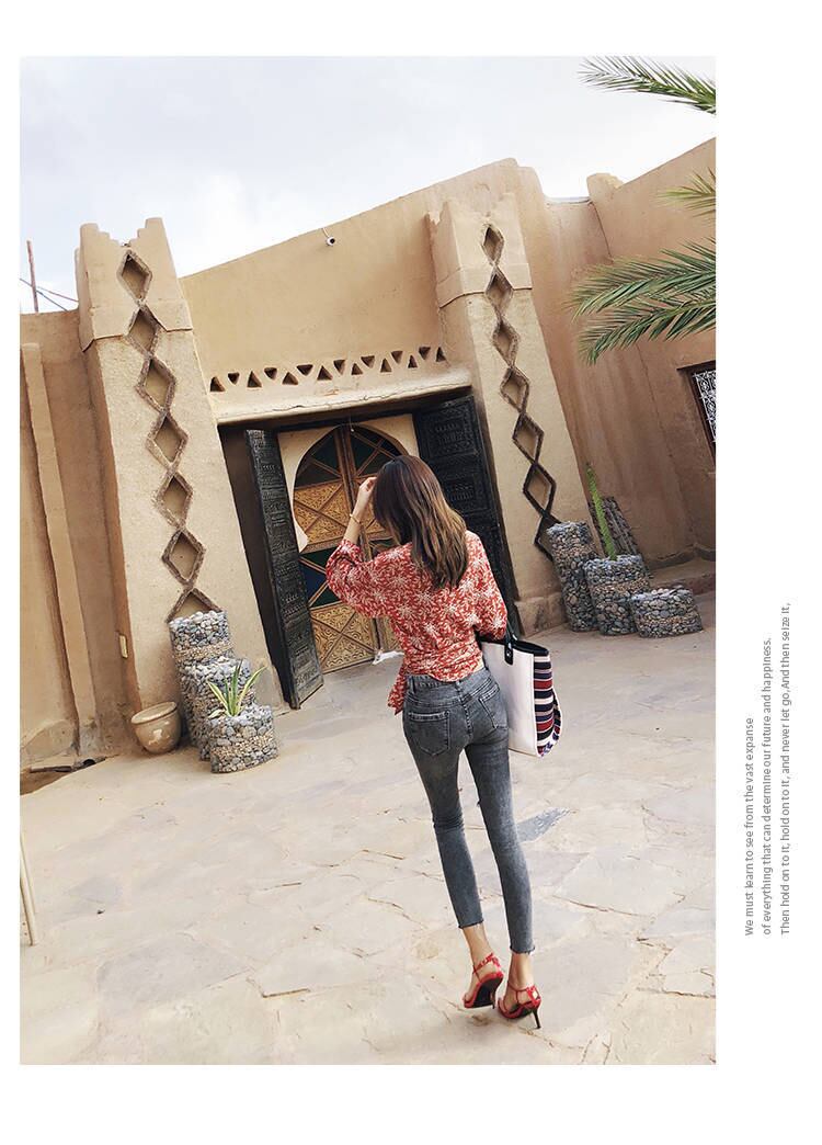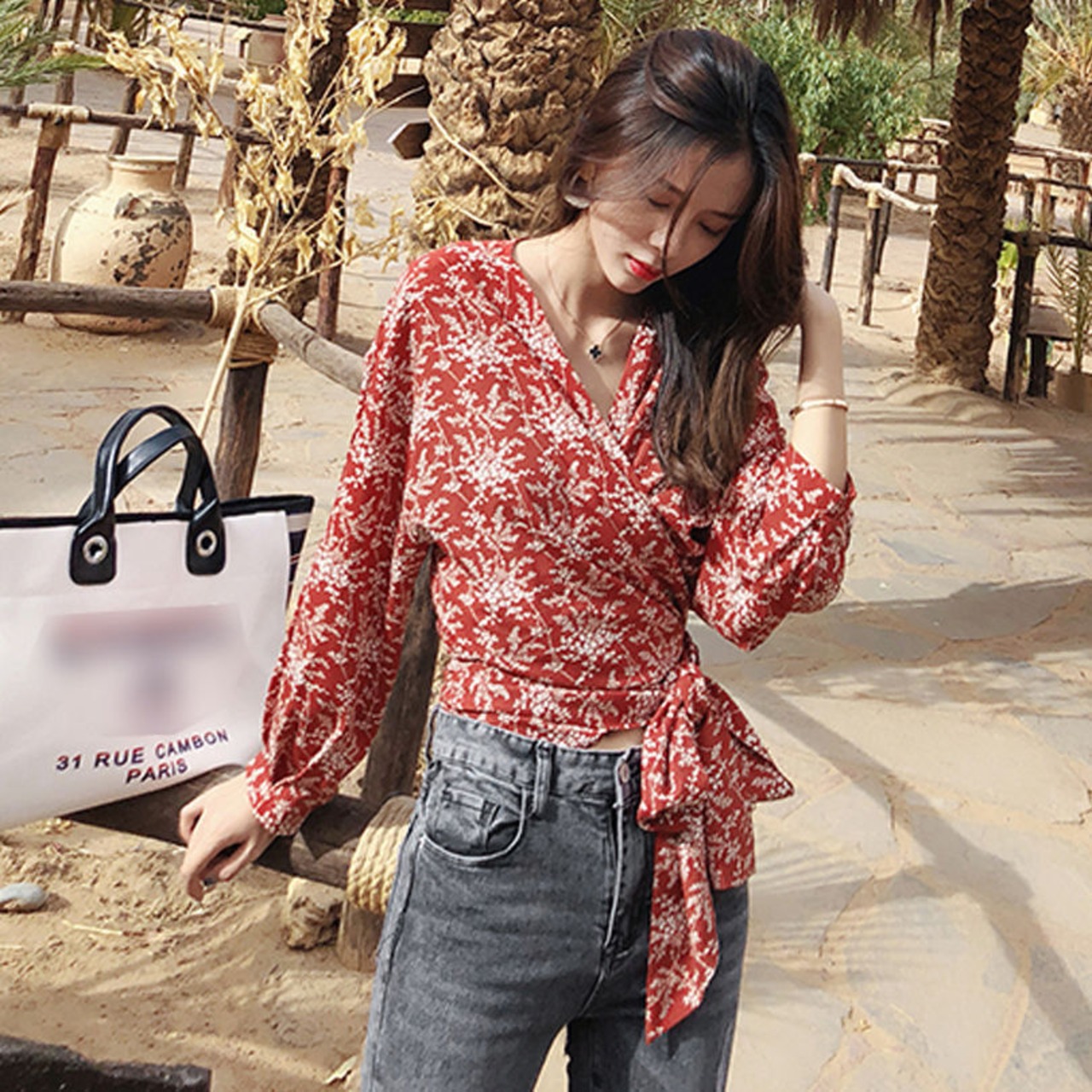 ベラ哲学 2020 春 V ネックブラウス女性ランタンスリーブプリントシャツ女性花柄シフォントップスサッシブラウス スプリング 春物 Vネック bel36974817187