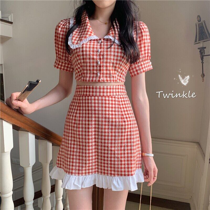 オルシックな甘い夏 2 点セット女性原宿チェック柄クロップトップショートシャツミニスカートセットスリムインツーピーススーツ 大人ガーリー スウィート キュート カジュアル かわいい サマー 夏物 bel25745817298 | aliel
