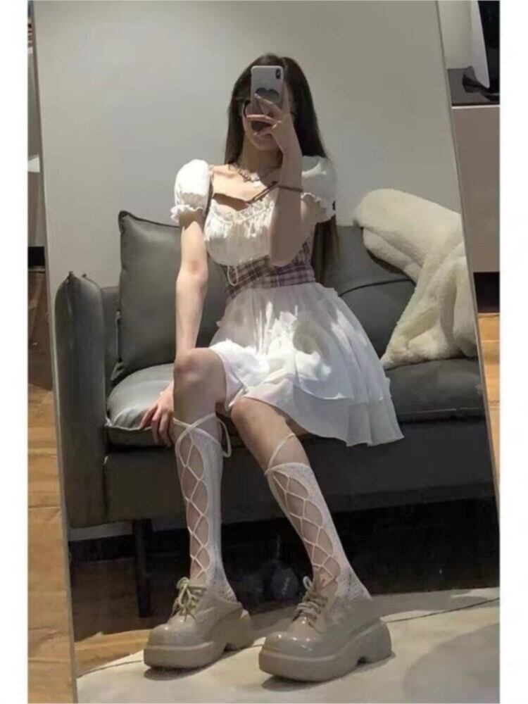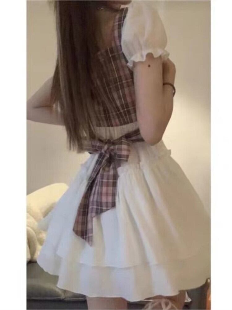 2022年の新しい甘くてクールなフェイクのツーピースのチェック柄の弓のストラップのデザインのウエストとスリムなフリルのドレス リボン 大人ガーリー スウィート キュート カジュアル bel55942075923 | aliel