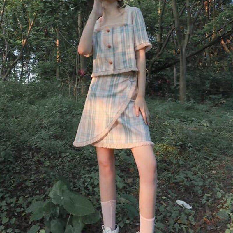 女性 2020 夏スウィートストライプスーツスクエアカラーブラウス + Wiast レースアップスカート 2 点セット 大人ガーリー キュート カジュアル サマー 夏物 スクウェア bel11515677606 | aliel