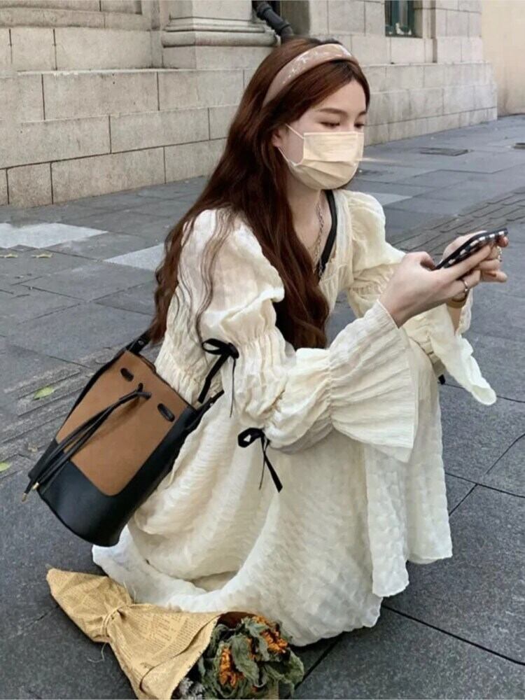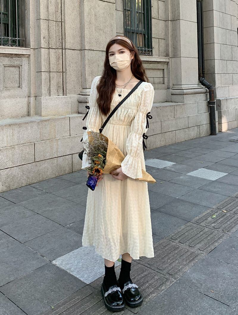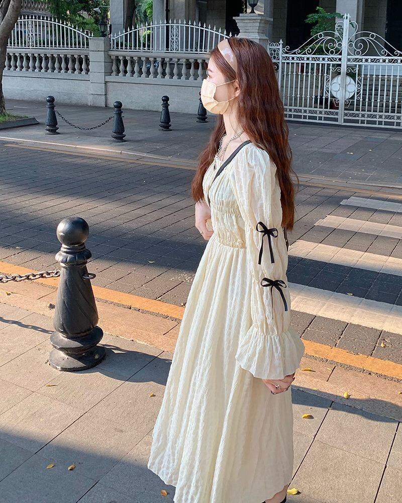 2023 春の女性フレアスリーブロングドレススクエアカラーウエストスウィートドレスボウプレッピースタイルドレス リボン 大人ガーリー キュート カジュアル スプリング 春物 スクウェア bel19380337698 | aliel