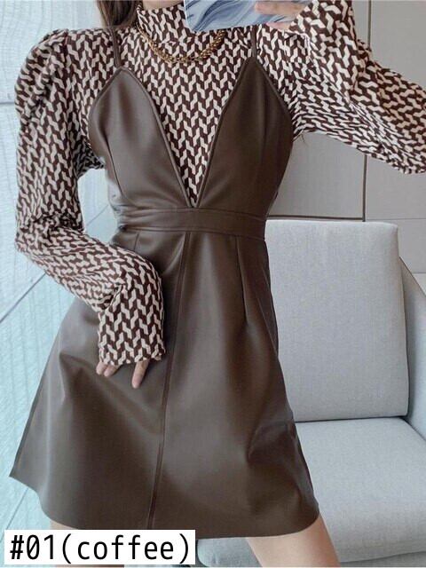 女性春秋の二枚ドレスセットプリントブラウスシャツ + ストラップレス PU フェイクレザーミニドレススーツオフィスレディセット スプリング 春物 オータム 秋物 ファー 会社 学校 通勤や通学にも bel75848692427 | aliel