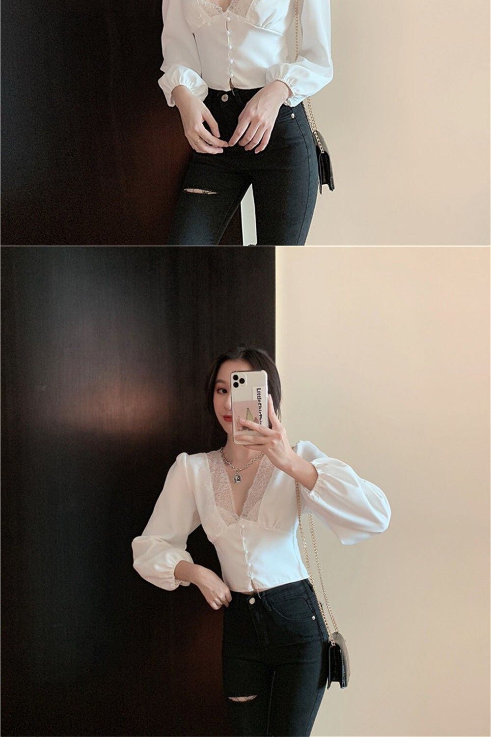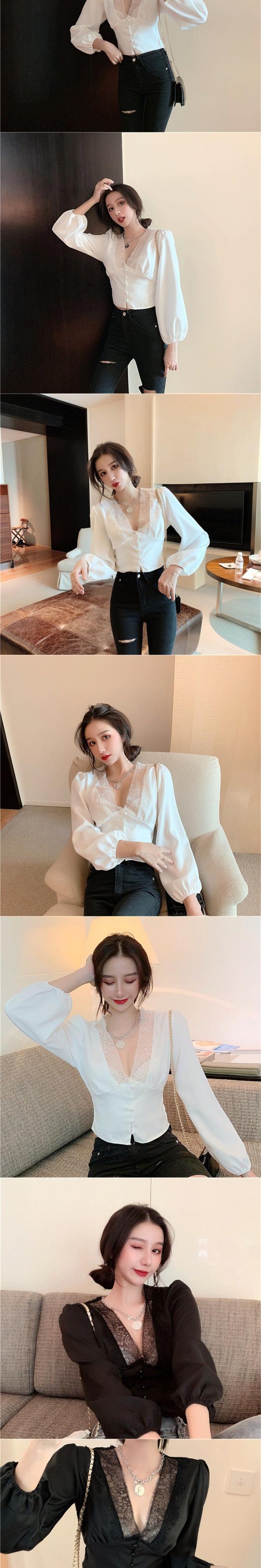 女性春秋 V ネックトップスレトロソリッドレースボタンスリーブボタンシャツオフィスレディスリムブラウス スプリング 春物 オータム 秋物 Vネック ソリッドカラー 会社 学校 通勤や通学にも bel21184816209 | aliel