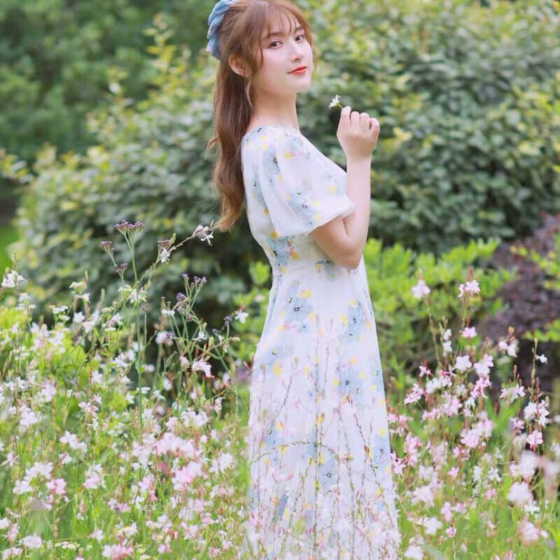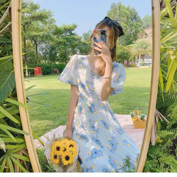 夏の花ドレス女性フレンチスタイルのプリントシフォン妖精ドレスパフスリーブスタイルの甘いドレス 2020 大人ガーリー スウィート キュート カジュアル サマー 夏物 花柄 bel43225582448 | aliel