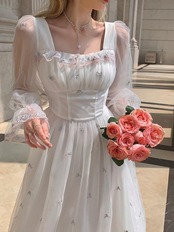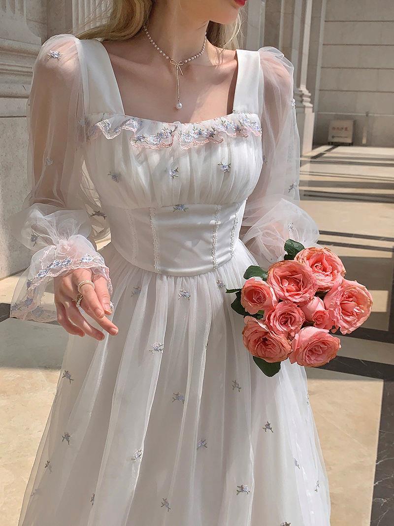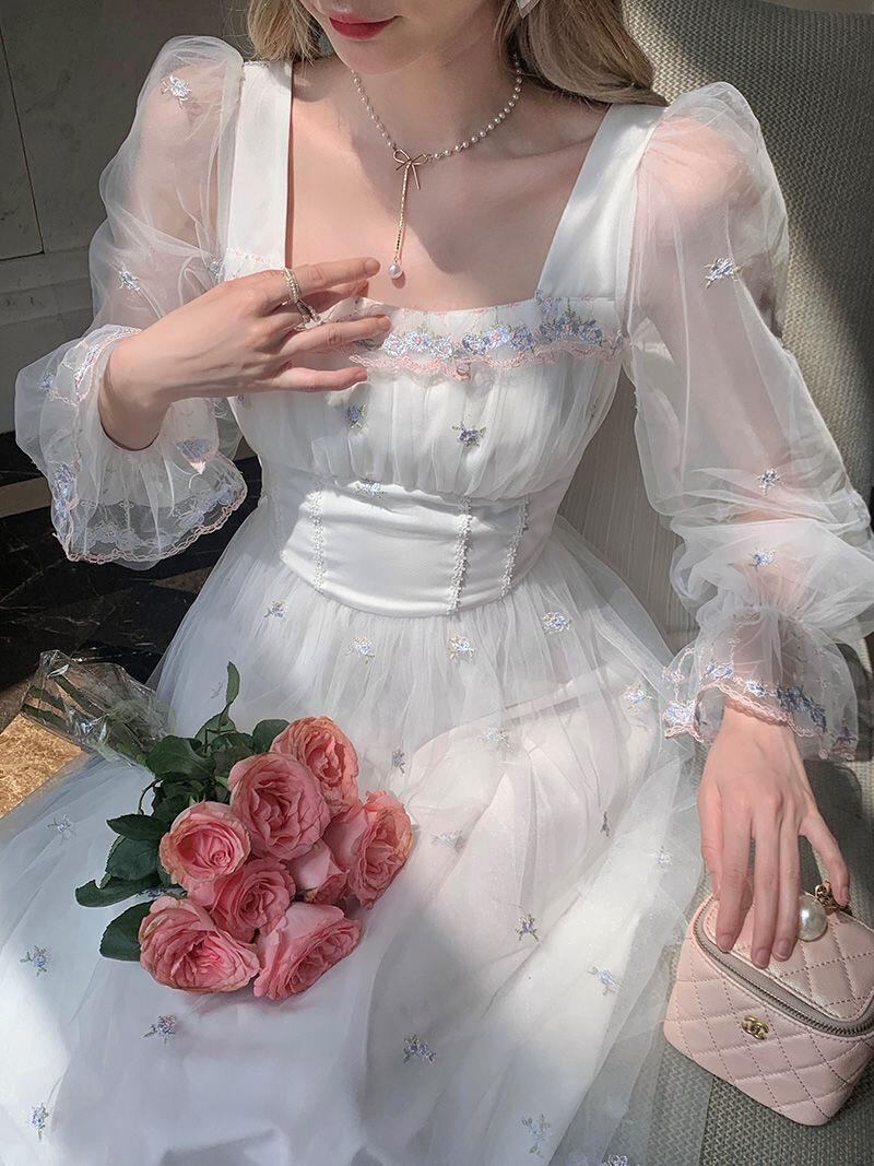 秋春ホワイト メッシュ妖精ドレス女性フランス刺繍花柄フレア スリーブ ウエディング ドレス Vestido Blanco フレアスリーブ スプリング 春物 オータム 秋物 bel52029067757 | aliel