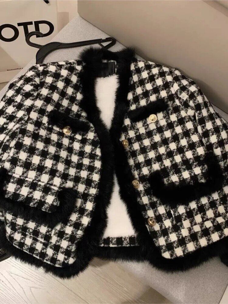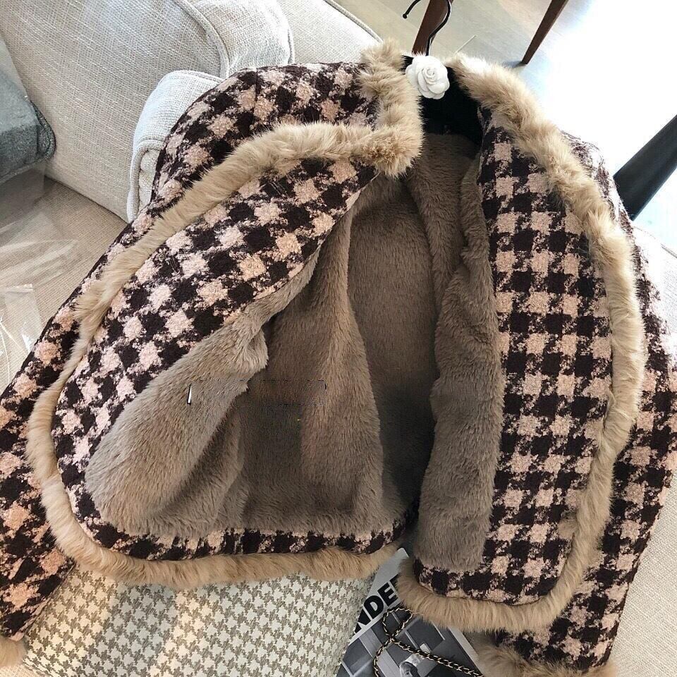 オフィスレディオーバーコート冬シングルブレストチェック柄カシミヤショートツイードジャケット女性厚みのある暖かいフェイクファーコート Elegent ウィンター 冬物 会社 学校 通勤や通学にも bel14673135883 | aliel