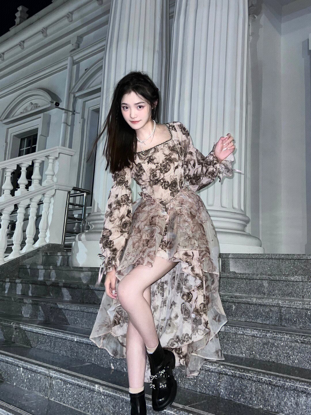 プリント花柄イブニングドレス女性メッシュミディパーティードレスパフスリーブスウィートドレススクエアカラー秋のビーチドレス 大人ガーリー キュート カジュアル オータム 秋物 スクウェア bel44565545066 | aliel