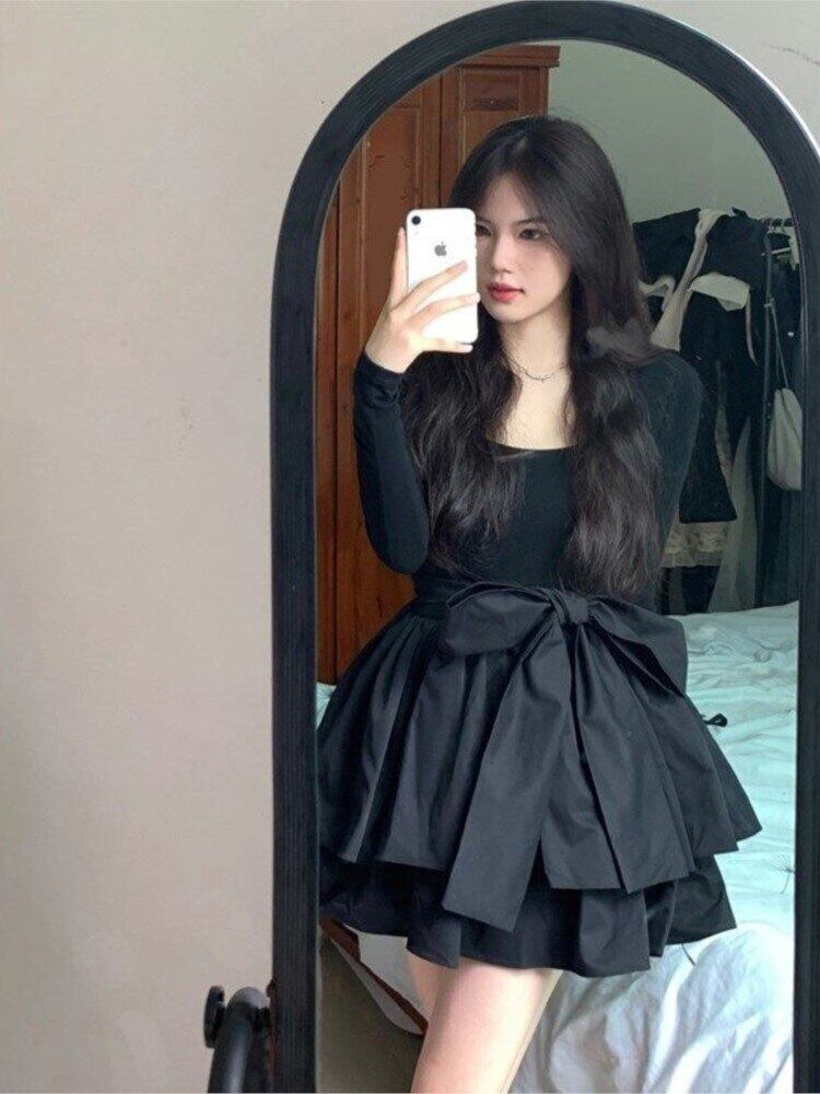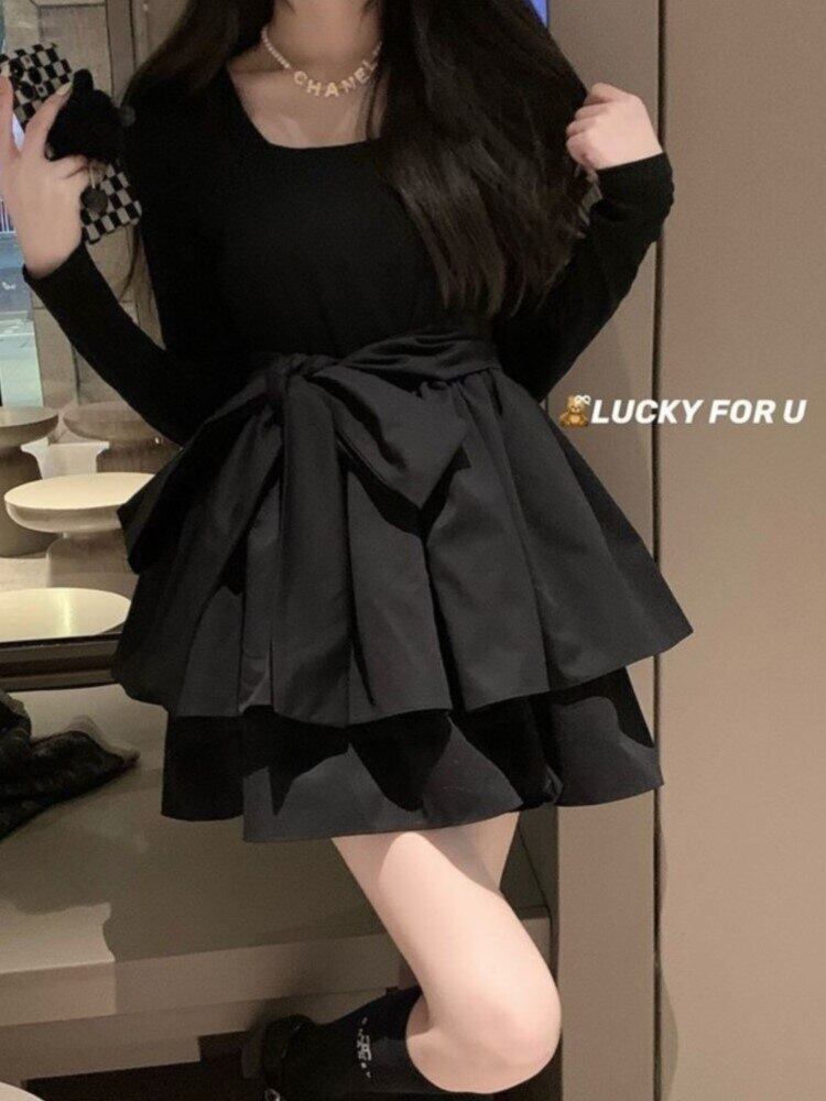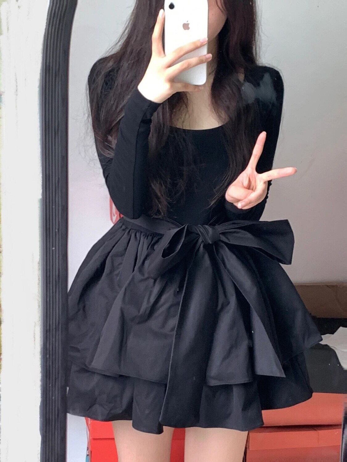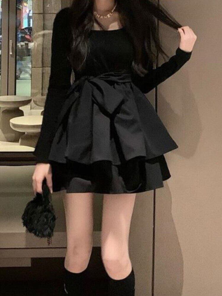 秋冬フレンチヘップバーンボウドレスレディーススクエアネックスモールブラックドレスファッションカジュアルパーティードレス リボン ウィンター 冬物 スクウェア bel53734459805 | aliel