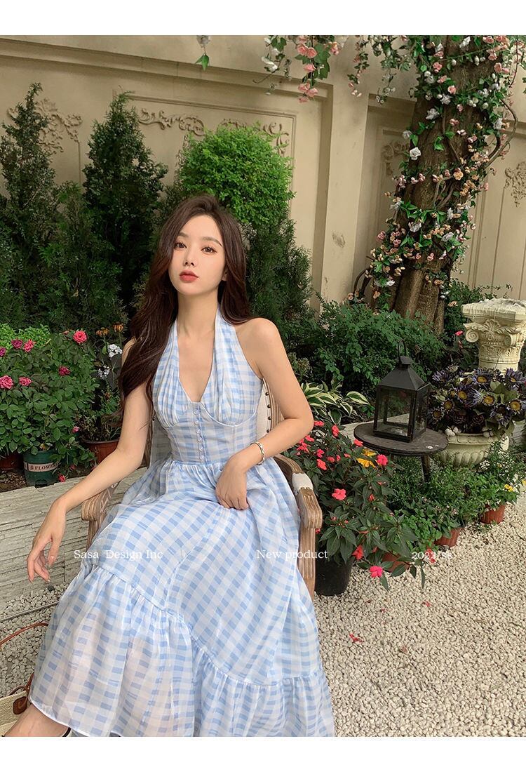 チェック柄プリント ストラップ ドレス夏の女性のドレス - ウエスト V ネック ホルター ノースリーブ ホリデー ビーチ スリング自由奔放に生きるドレス サマー 夏物 Vネック bel60614366898 | aliel