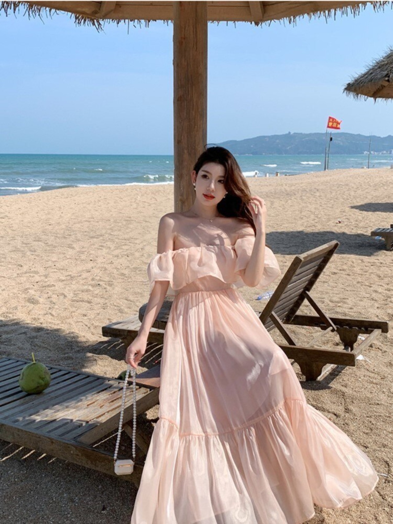 2023 女性オフショルダーフリルフェアリーピンクドレスノースリーブホリデーウエストビーチドレスレディフランス甘いドレス 大人ガーリー スウィート キュート カジュアル bel48716437835 | aliel