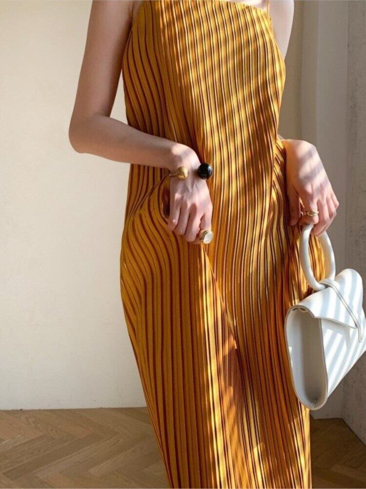 2023 春夏女性プリーツソリッドストラップドレスオフィスレディサテンミディドレスホリデービーチドレス スプリング 春物 サマー 夏物 ソリッドカラー 会社 学校 通勤や通学にも bel75076249871 | aliel