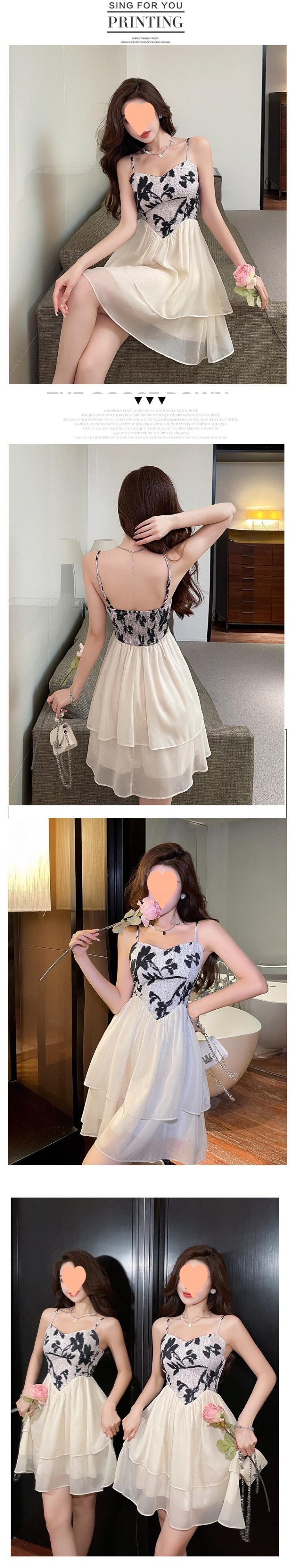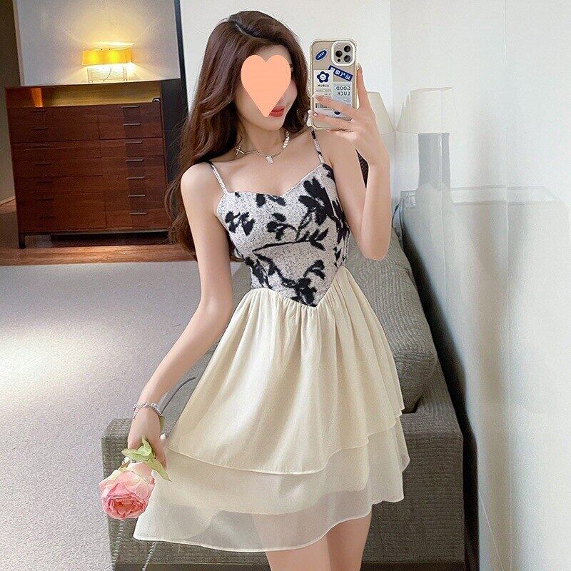 2023フレンチスウィートシフォンドレス妖精プリントキャミストラップドレス黒弾性ミディドレスローブセクシーなファムvestidosデフェスタ ブラック エラスティック 伸縮 大人ガーリー キュート カジュアル フェミニン bel11671739318 | aliel