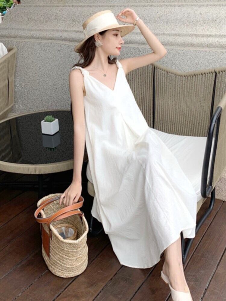 夏のビーチホリデーホワイトドレス 2023 女性ソリッドカラー V ネックスリップドレスシンプルなウエストストラップドレスコットンとリネン サマー 夏物 Vネック bel51381195568 | aliel