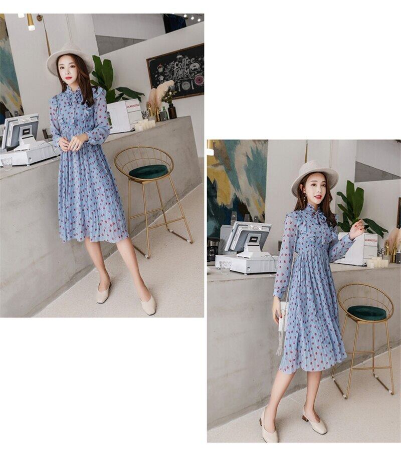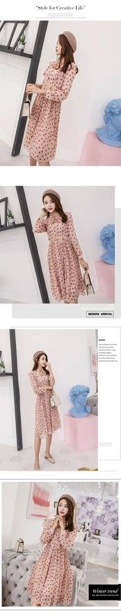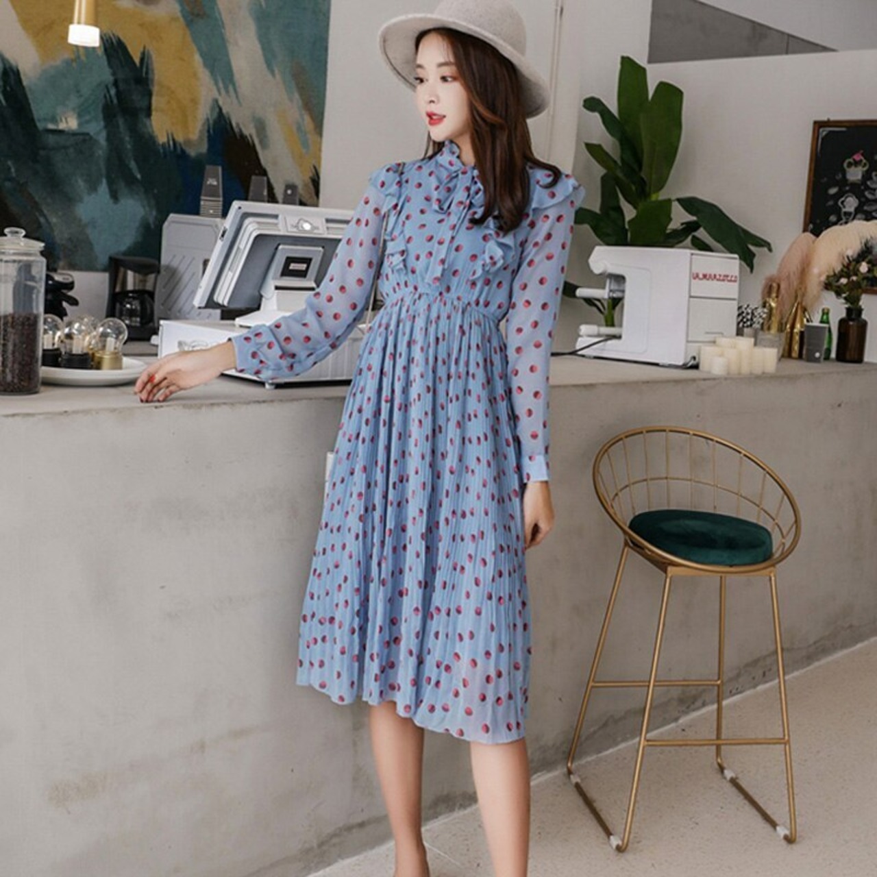 ドットプリントシフォンドレス女性フリル弾性ウエスト A ラインミディドレス 2019 秋のレースアップ Vestido ラッフル エラスティック 伸縮 オータム 秋物 Aライン bel29536717729 | aliel