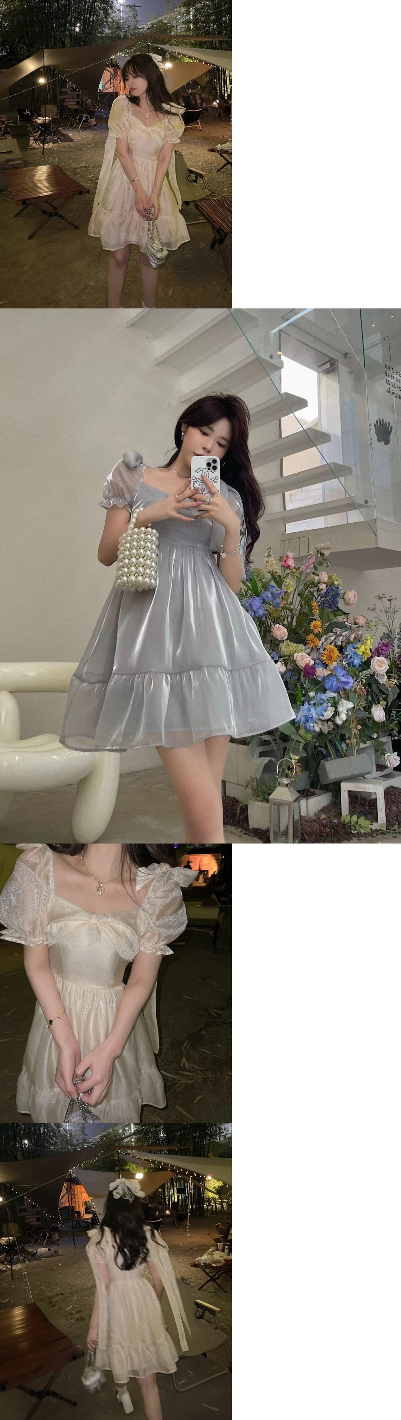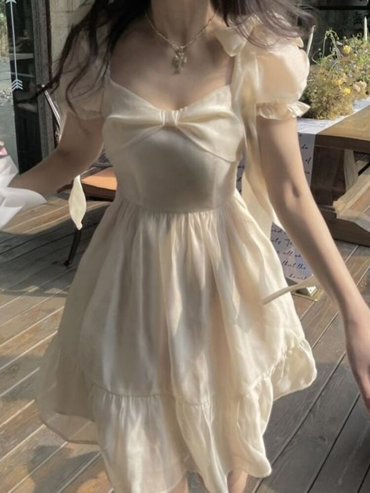 2023 夏スウィートパフスリーブ妖精ドレス女性弓ミニドレス固体 ese パーティードレス リボン 大人ガーリー キュート カジュアル サマー 夏物 ソリッドカラー bel50342606864 | aliel