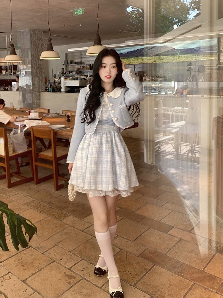 女性ブルーチェック柄ドレスレースパーティーミニドレス弓甘いストラップドレス秋 2022 リボン 大人ガーリー スウィート キュート カジュアル オータム 秋物 bel9470818065