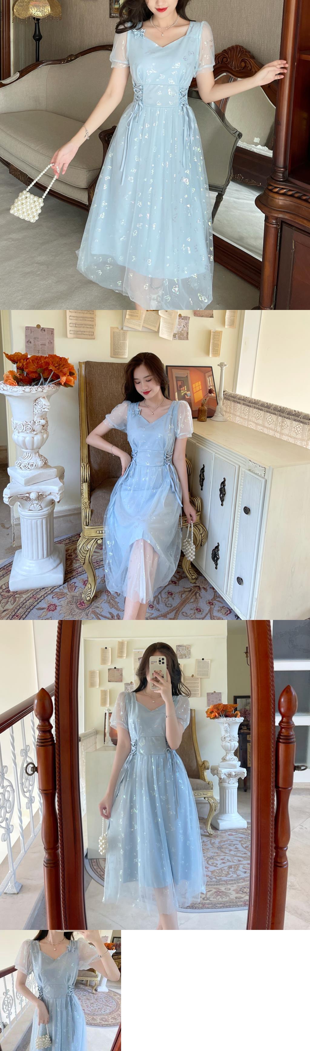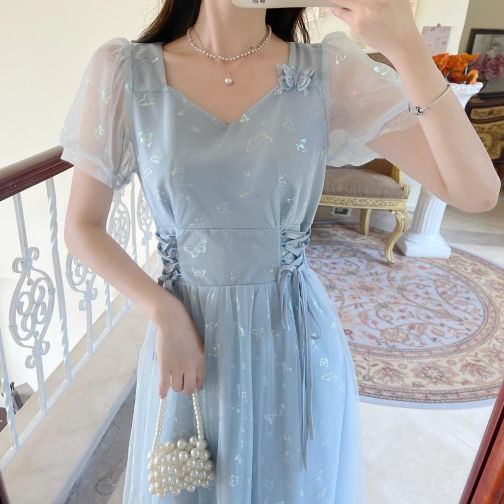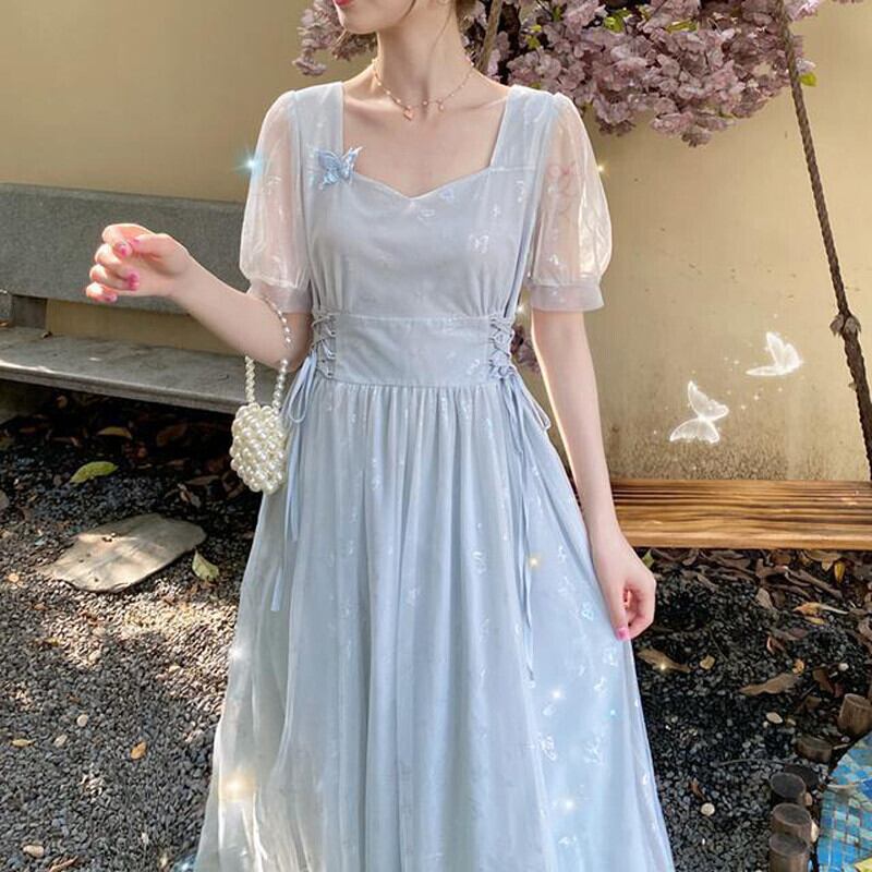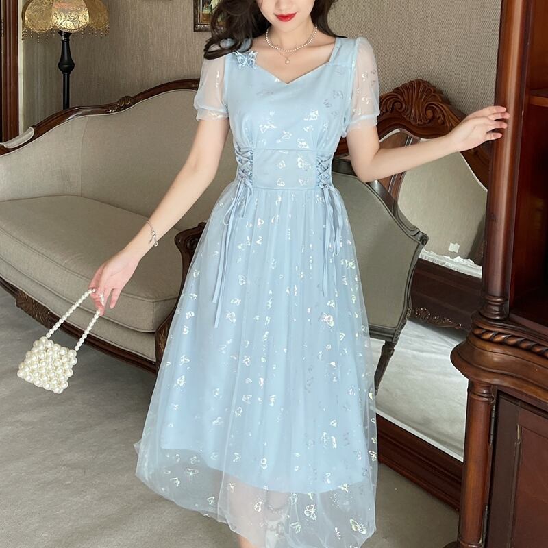 2021 ブルー高級メッシュサマードレス女性スクエアカラーブルー半袖レースアップウエストホリデーパーティーロングドレス ショート ハーフスリーブ 夏物 スクウェア bel34817533960 | aliel