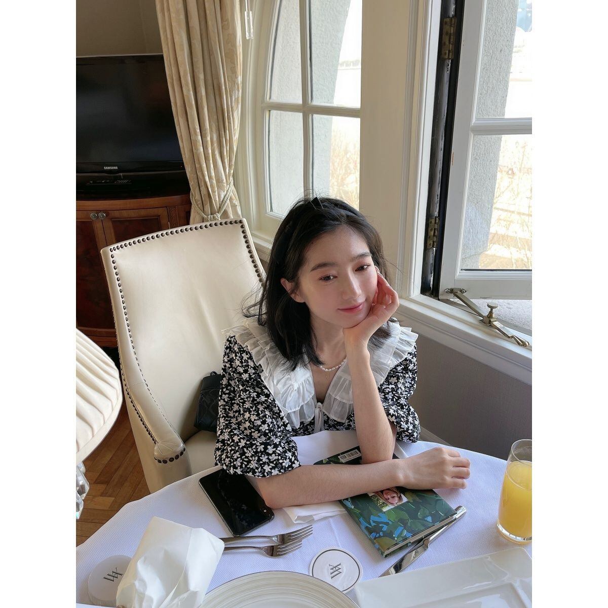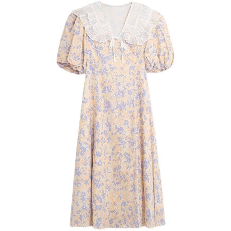 Bella Philosophy 2021 サマー ロマンティック パフスリーブ ピーターパン カラー イエロー パープル プリント ドレス Aライン マキシドレス 夏物 bel65790629134 | aliel