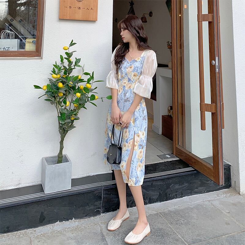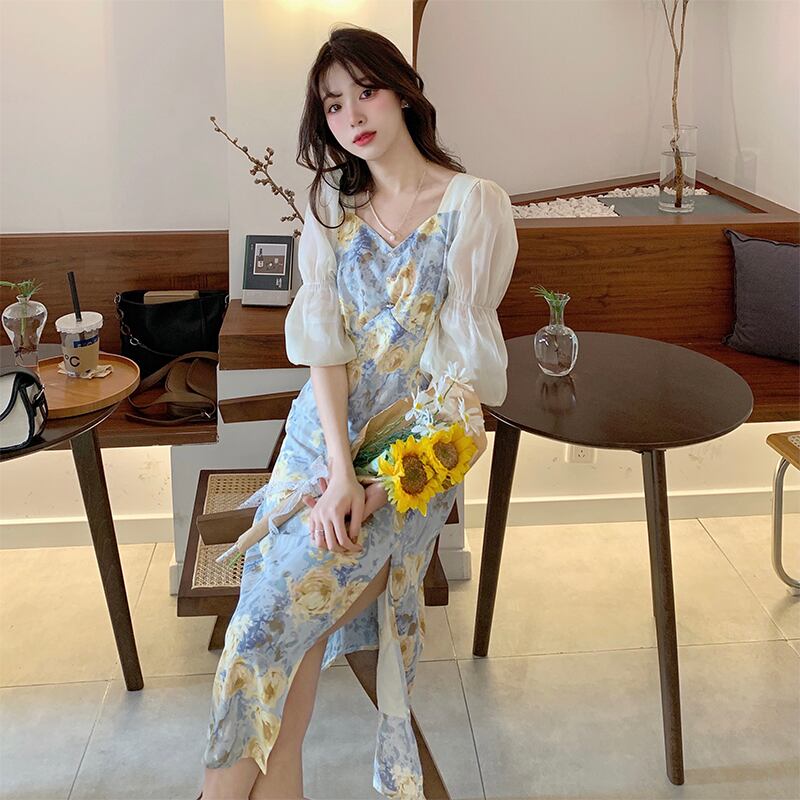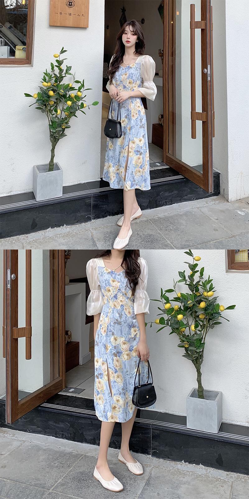 夏の花ドレス女性フレンチスプリット甘い黄色のドレスパフスリーブパーティーミディドレス 2021 大人ガーリー スウィート キュート カジュアル サマー 夏物 花柄 bel47458343792 | aliel