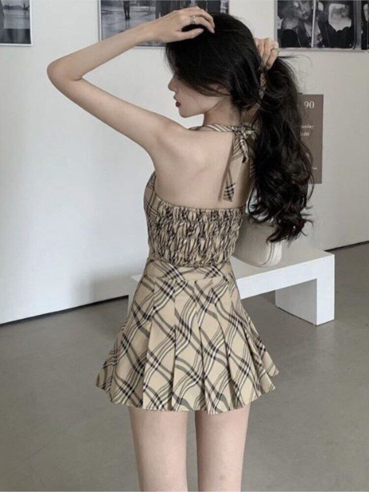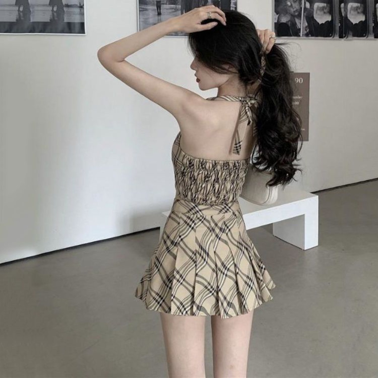 格子縞のスーツの女性弾性キャミソール + ショートスカートツーピースセット 2023 夏の気質ヴィンテージパッチワークノースリーブスーツトレンド エラスティック 伸縮 サマー 夏物 ビンテージ bel17384596785 | aliel