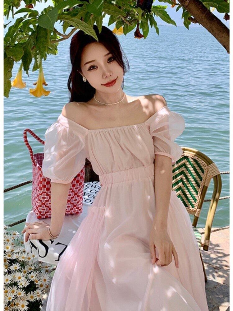 夏ピンクシフォンランタンスリーブ半袖妖精ドレス女性ホリデー甘いプリーツサンドレスミディ背中の開いた包帯ドレス ショート ハーフスリーブ 大人ガーリー スウィート キュート カジュアル サマー 夏物 bel53691146624 | aliel