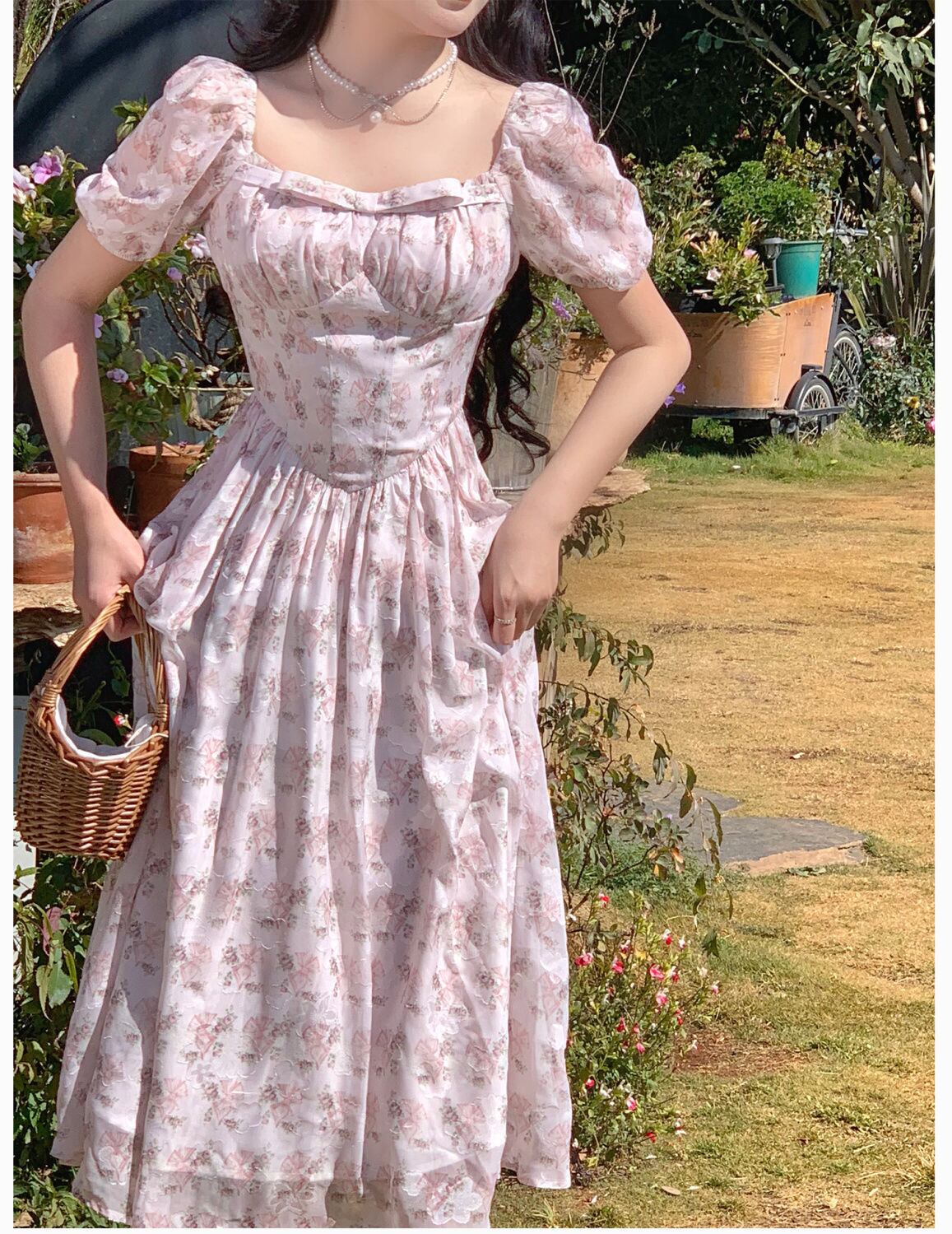 サマーパフスリーブフランススタイルドレスウエストプリントスウィートスクエアカラーホリデードレスワンピースドレス 大人ガーリー キュート カジュアル 夏物 スクウェア bel53044555725 | aliel