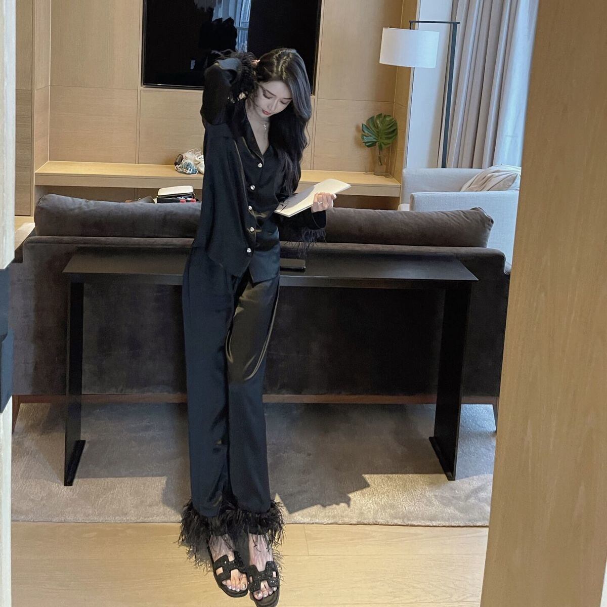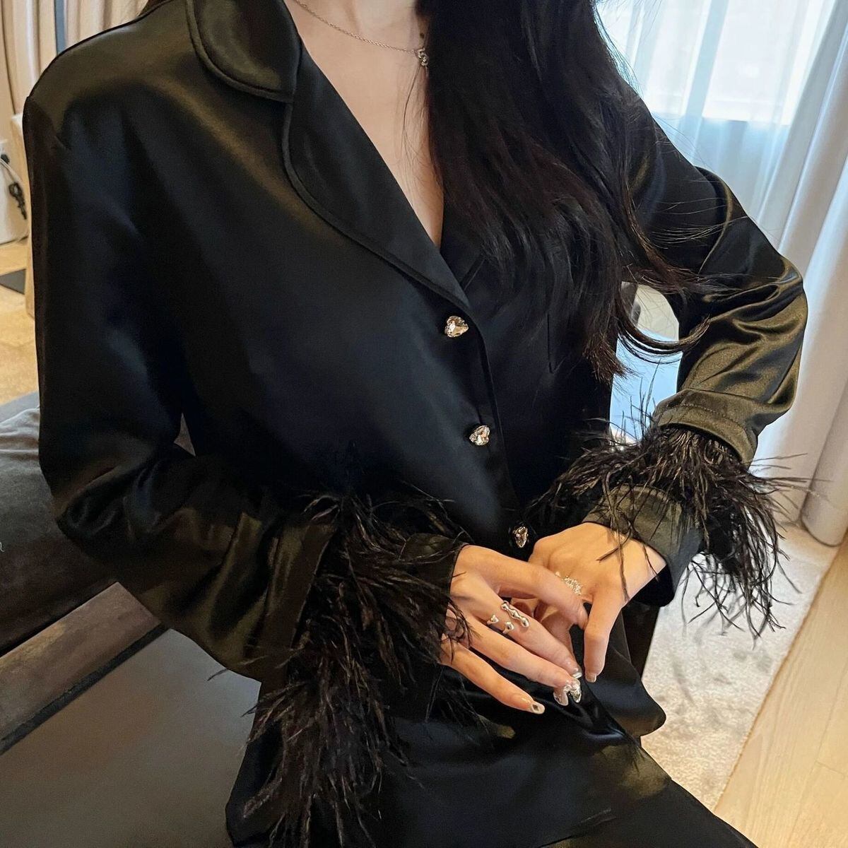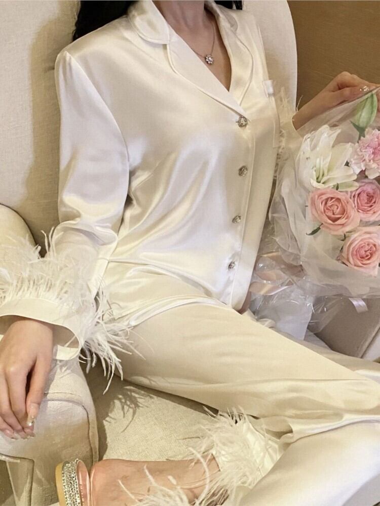 かわいいのようなアセテート繊維ライト高級ダチョウの羽パジャマツーピーススーツサテンパジャマ女性パジャマホームウェア 大人ガーリー スウィート キュート カジュアル bel60884300274 | aliel