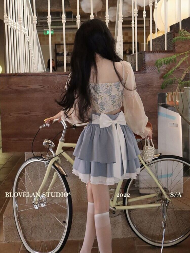 春パフスリーブ甘いブラウス + ケーキスカートスーツレースミニドレス 2 ピースセット Y2k プリントクロップトップ衣装 大人ガーリー スウィート キュート カジュアル スプリング 春物 bel10825526102 | aliel